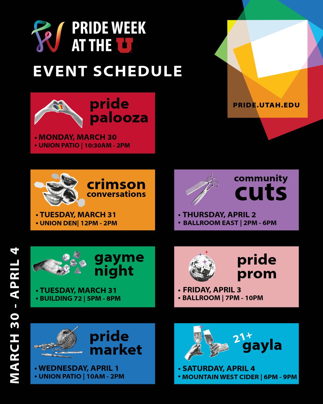 Stitched in Solidarity: Parade and Pride Palooza | 10:30am-2:00pm @ Stillwell Field Gazebo Union Patio, University of Utah, SLC. Event by The Center for Community & Cultural Engagement: "University of Utah, show us your Pride! Start the University of Utah's 2025 Pride Week Celebration right with a campus Pride Parade beginning at 10:30am at the Stillwell Field Gazebo Union Patio. We'll parade through campus down to the Union Patio for Pride Palooza, featuring music, food, a ribbon-cutting ceremony, and student performances from groups like U Go Girl, U Asia's student K-Pop Group! Make sure to arrive on time to take advantage of free food while supplies last. All are welcome! We hope to see you there!"