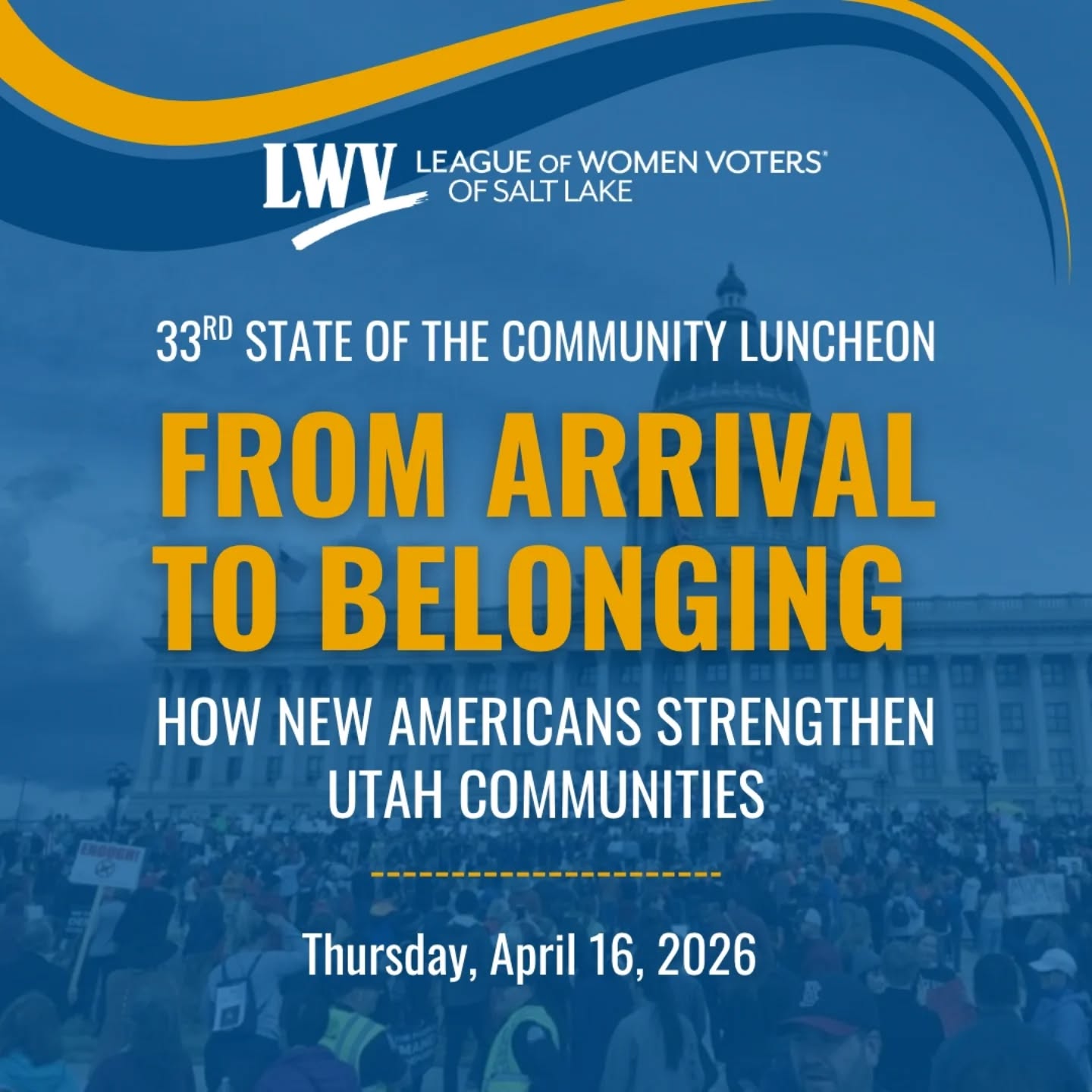 The League of Women Voters of Salt Lake's 33rd Annual State of the Community Luncheon | 12-2 PM @ Hilton City Center, SLC. "Our 2026 'From Arrival to Belonging: How New Americans Strengthen Utah Communities', with keynote speaker Katie Donoviel, Executive Director of the English Skills Learning Center, is a cornerstone fundraising event to spotlight important issues in our community and raise funds for mobilizing voters to preserve our democracy." For tickets and info, click here.