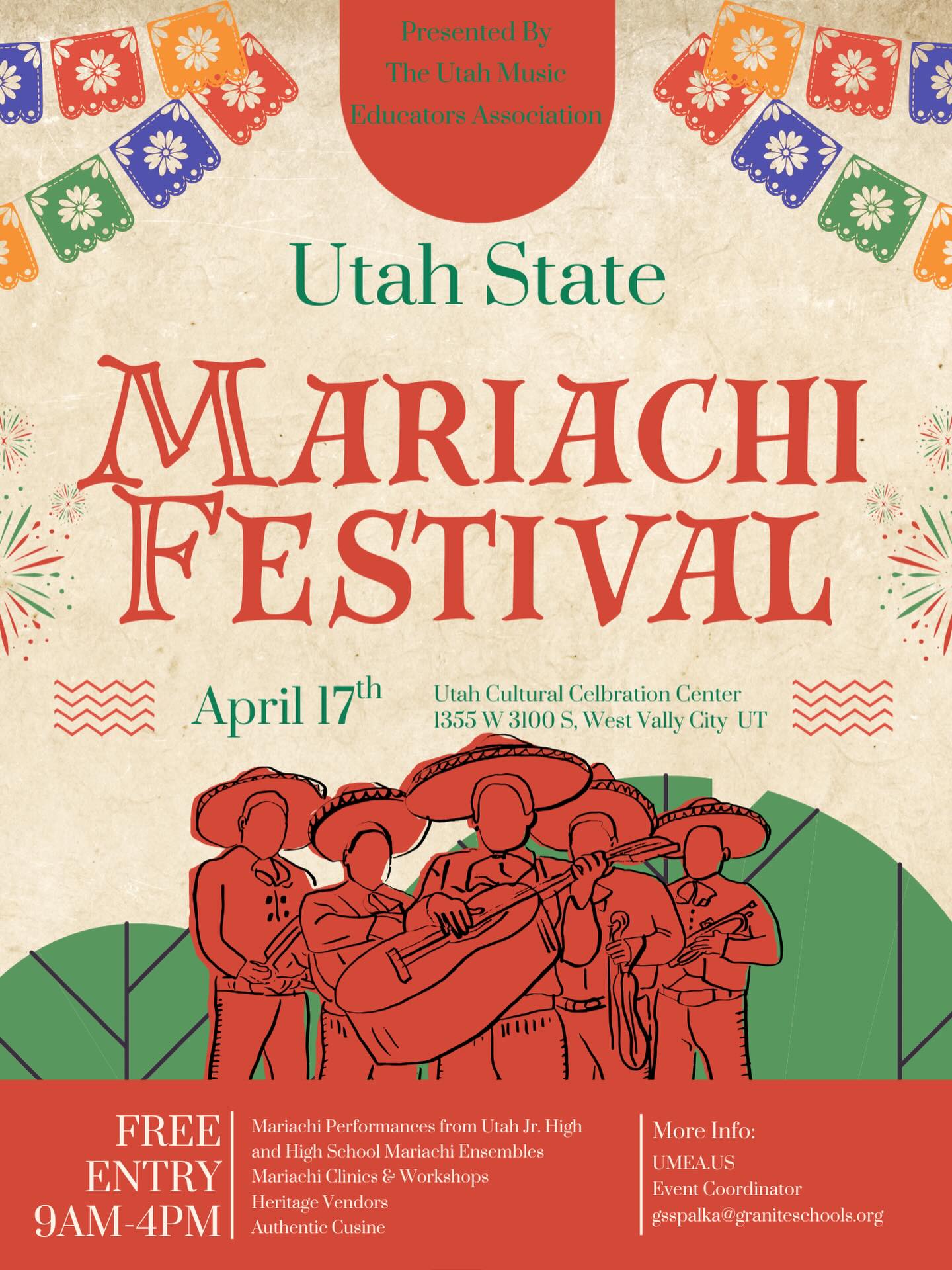 1st Annual Utah State Mariachi Festival presented by the Utah Music Educators Association | 9A-4P @ Utah Cultural Celebration Center, 1355 W 3100 S, WVC. Event by Mariachi Royal de Granger and Utah Cultural Celebration Center: "Join us for the 1st Annual Utah State Mariachi Festival presented by the Utah Music Educators Association. Help us celebrate school mariachi programs from across the state of Utah. This event features Jr. High School and High School Mariachi groups, local vendors, and food trucks."