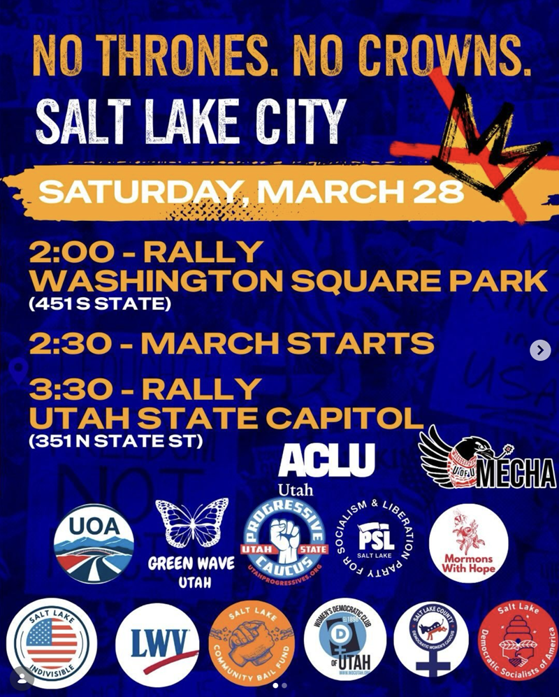 No Kings Rally SLC | 2:00 PM @ Washington Square Park (WSP), 451 S State St, SLC.At 2:30 PM, folks will start the march to the Utah State Capitol, where the rally will resume by 3:30 PM. To find or sponsor one in your town, visit mobilize.us/nokings/?q=Utah