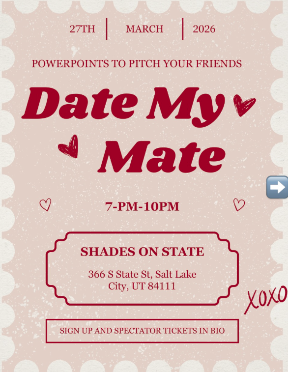 Date My Mate | 7-10 PM @ Shades on State, 366 S State St, SLC. "A dating mixer where people present their single friends with a 3-5 minute pitch deck to a live crowd."