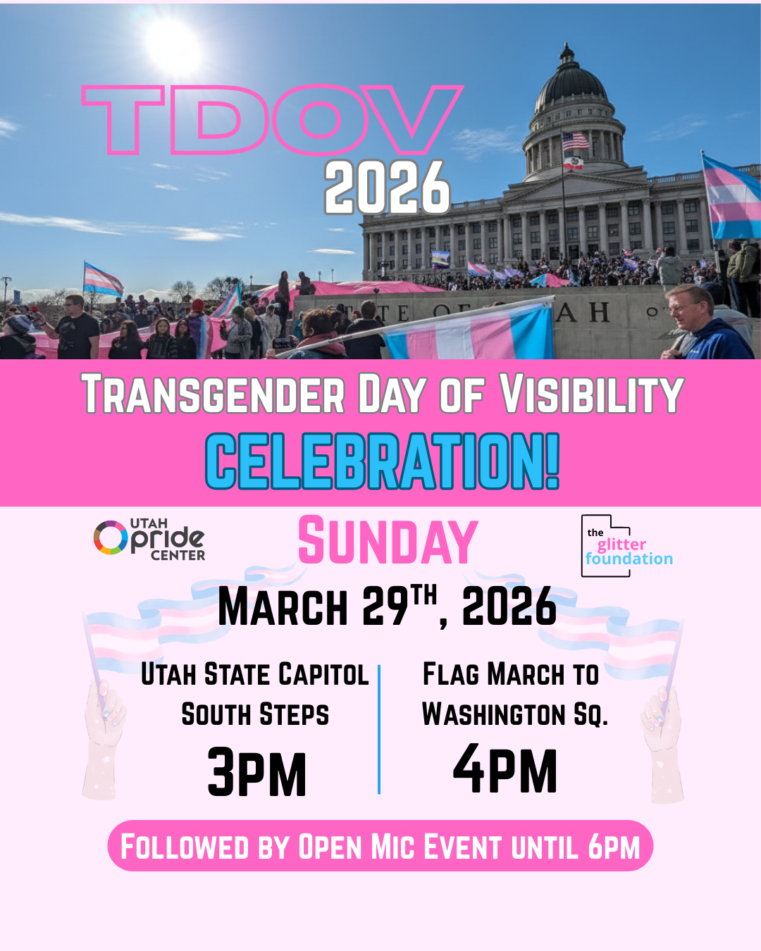 Transgender Day of Visibility Rally & March| 3-6 PM @ Utah State Capitol, 350 N State St, SLC. "The Utah Pride Center and Glitter Foundation Utah are thrilled to host our second Transgender Day of Visibility Rally & March. Join us on the steps of the Utah State Capitol as local transgender leaders and activists share messages of hope, strength, and resilience. After the rally, we’ll march the state's largest transgender flag from the Capitol to the Salt Lake City & County Building, 451 S State St, in a bold and visible show of community pride. An open mic will follow once we get there. We’ll also need volunteers! It takes roughly 200 people to carry the state’s largest transgender flag. Sign up and be part of this powerful moment."