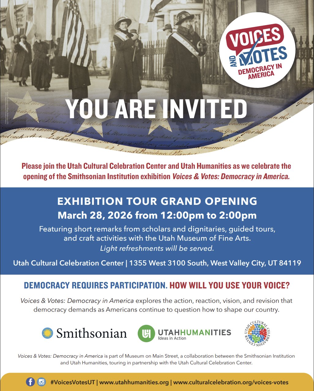 Closing Day of Voices & Votes: Democracy in America in West Valley as Part of America250 @ Utah Cultural Celebration Center, 1355 W 3100 S, WVC. "This nationally recognized Smithsonian traveling exhibition explores the past, present, and future of American democracy." FREE and open to the public Monday-Thursday, 8A-6P; Friday-Saturday, 9A-4P.