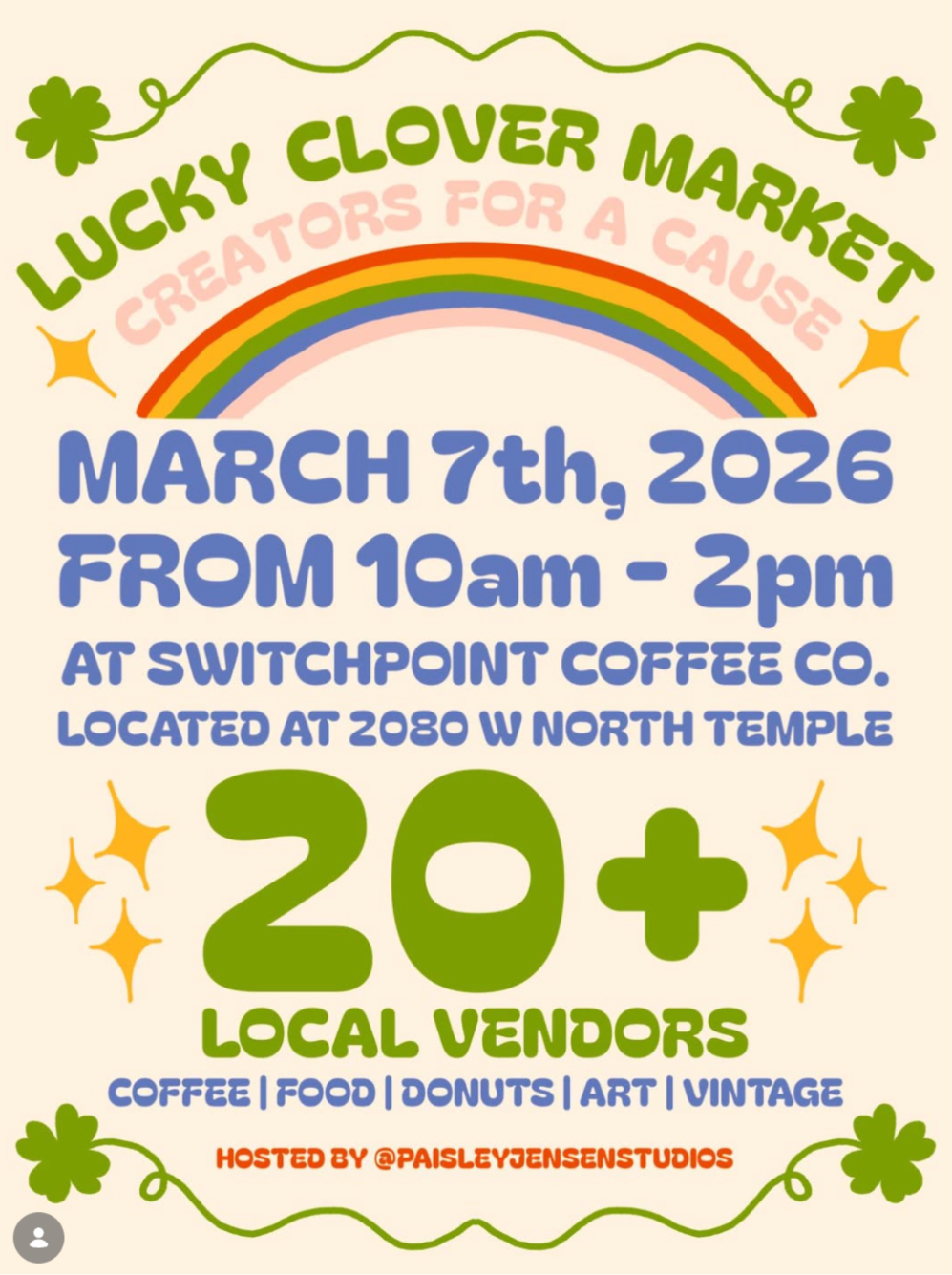 Lucky Clover Market - Creators for a Cause | 10A-2P @ Switchpoint Coffee Co., 2080 W North Temple St, SLC. Featuring 20+ local vendors, coffee and food from @switchpointcoffee.slc, and good vibes all around. A benefit for Switchpoint CRC and its work to end homelessness.