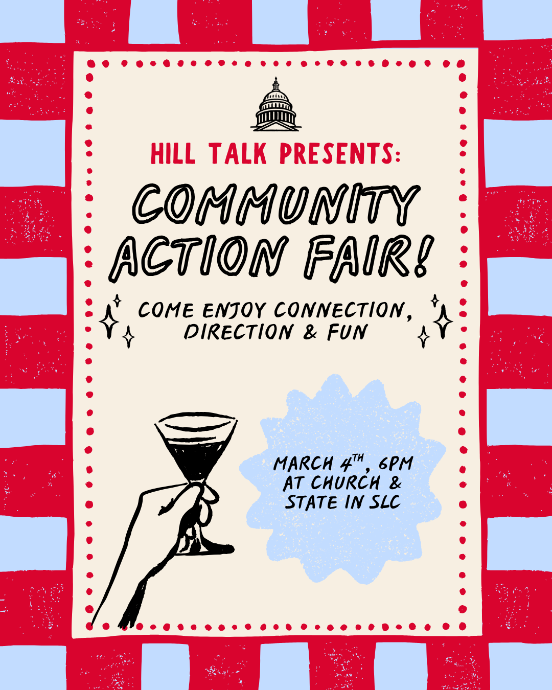 Hill Talk Community Action Fair | 6:00-7:30 PM @ Church & State, 370 S 300 E, SLC. Event by Elevate Utah, Better Boundaries & Better Utah: "Feeling angry, sad, or scared about the state of the world? Pause the doomscrolling and come meet organizations from across the county & state who are doing amazing work to make our community a better place. Come enjoy free pizza, drinks, and community!"