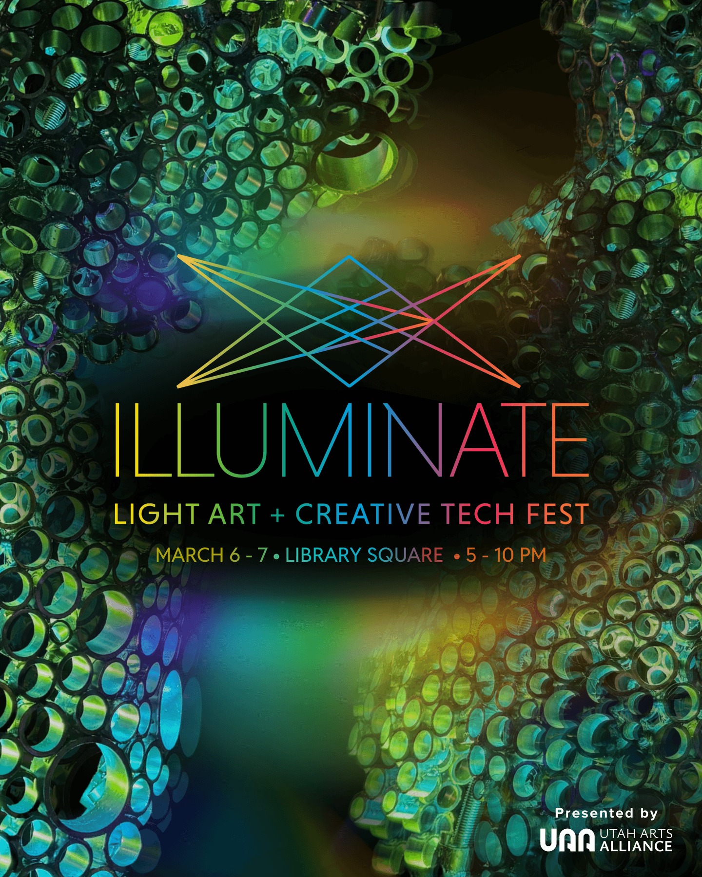 Illuminate 2026 | 5-10 PM @ Library Square, SLC. Event by Illuminate - Utah's Light Art + Creative Tech Fest: "ILLUMINATE is a festival celebrating the intersection between art and technology. Utah Arts Alliance works with a wide variety of artists, makers, performers, and community partners to showcase innovative creativity through large-scale art pieces, an interactive STEAM Lab, drone shows, and multimedia artwork." Presented by the Utah Arts Alliance.
