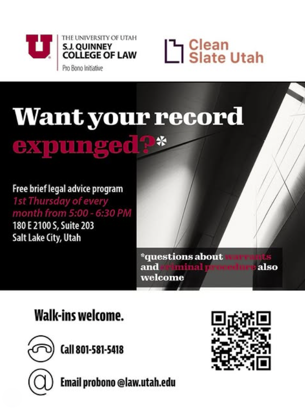 Clean Slate Utah Expungement Clinic with SJ Quinney Pro Bono Initiative | 5:00-6:30 PM @ USARA,180 E 2100 S #203, SLC. "Want your record expunged? Free in-person expungement consultations on the first Thursday of every month. No registration required. Walk-ins welcome." For more info, call 801-7581-5418 or email probono@law.utah.edu.