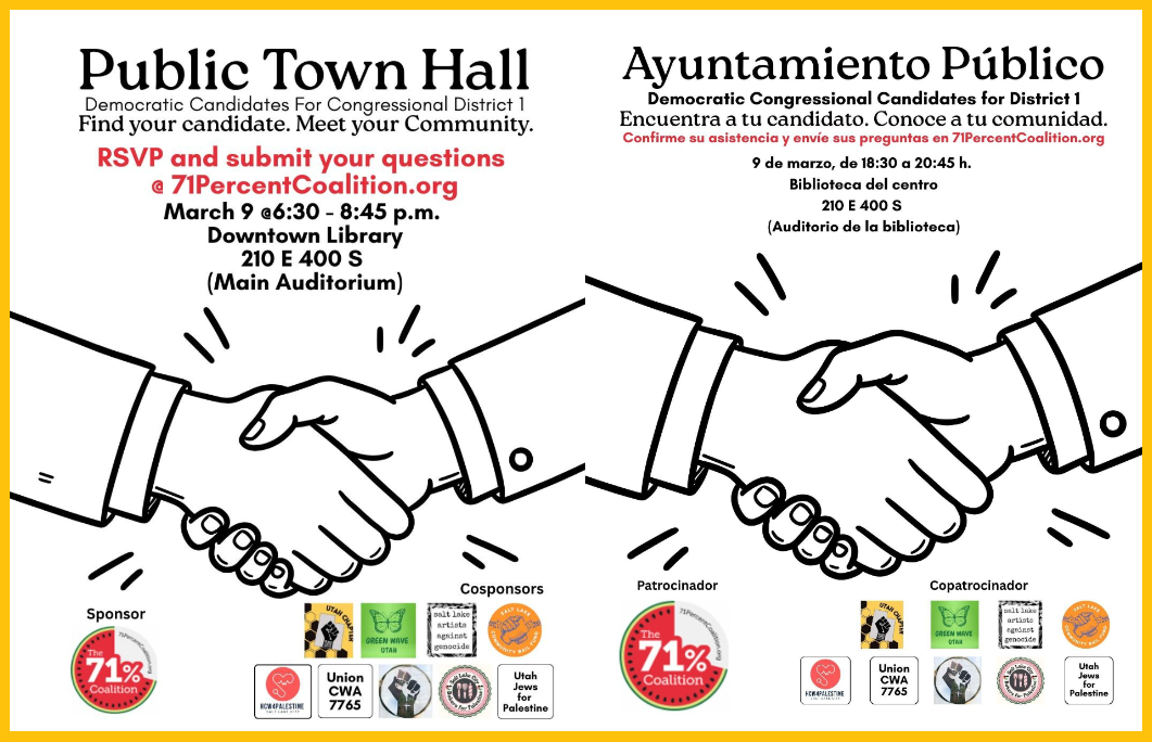 Public Town Hall for the 8 Democratic candidates for Congress in Utah’s CD-01 | 6:30-8:45 PM @ Salt Lake City Public Library Downtown, 210 E 400 S, SLC, in the Tessman Auditorium. Event by the 71 Percent Coalition and Black Lives Matter Utah Chapter. To RSVP and pose a question for candidates in advance, click here.