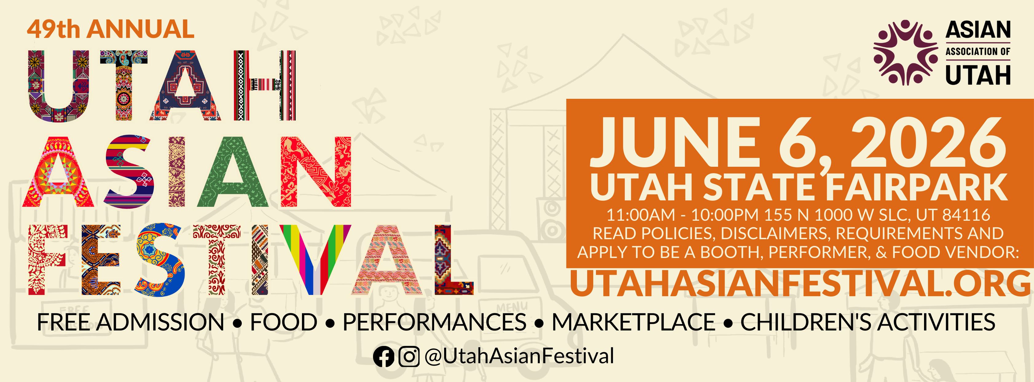SAVE THE DATE: 49th Utah Asian Festival | 11A-10P @ Utah State Fair Park, 155 N 1000 W, SLC. Applications are NOW OPEN for booths, food vendors, and performances. Priority deadline: March 6, 2026. For more info, visit utahasianfestival.org.