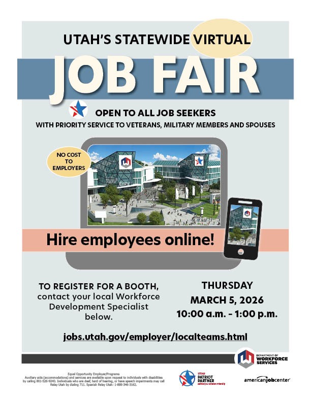 Utah's Statewide Virtual Job Fair| 10A-1P online. Event by Utah Department of Workforce Services: "Open to all job seekers with priority to veterans, military members and spouses. Get hired online! To register as a job seeker, please visit jobs.utah.gov and create an account or sign in to "My Job Search" (indicate your military or spouse status). Locate the Virtual Job Fair or Prep Workshops on your Dashboard. From there, select the event(s) to proceed. Job fair prep workshop available the day before from 10A-1P." For helpful videos to prepare for the fair and a list of employers expected to join the fair, click here.
