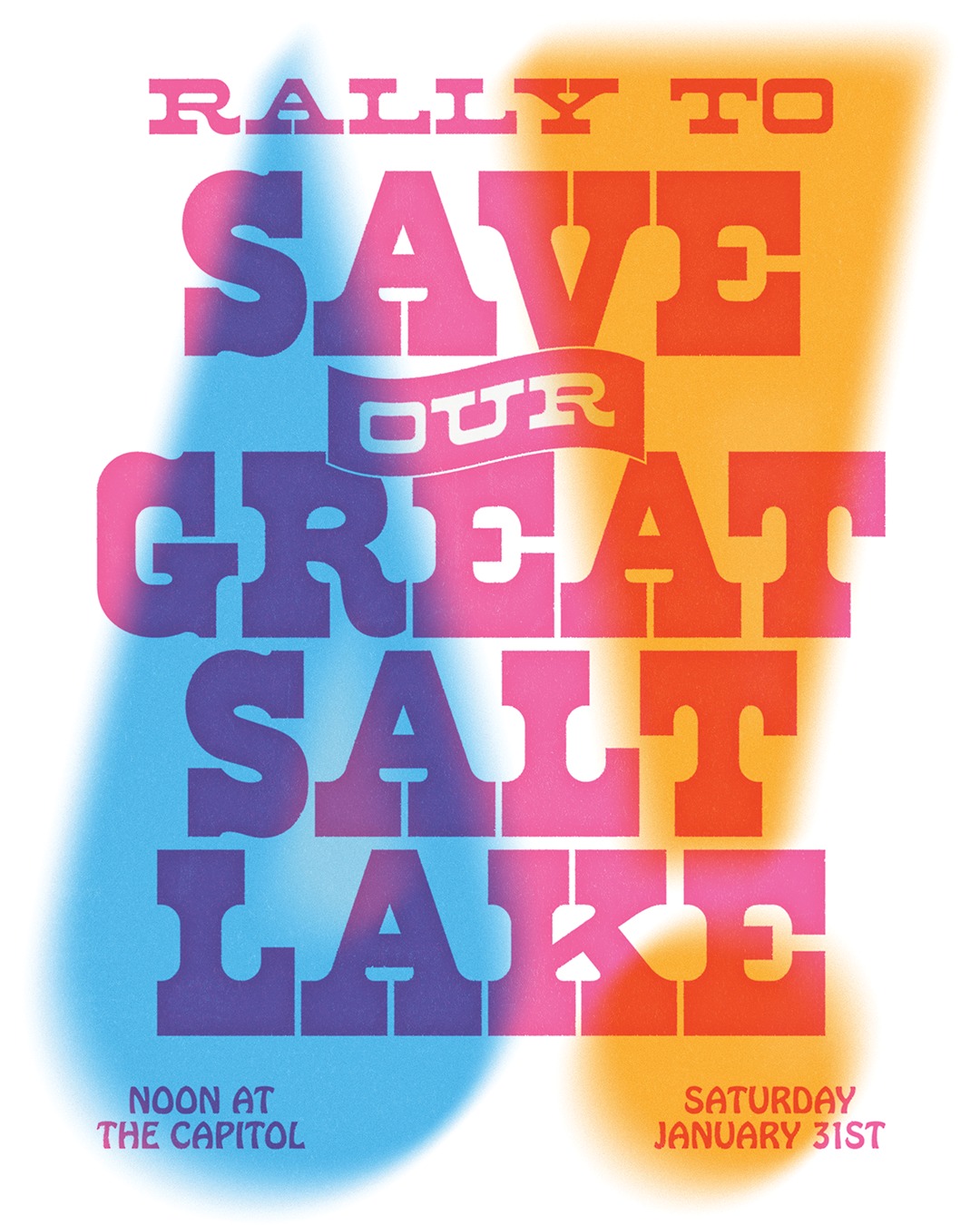 5th Annual Rally to Save Our Great Salt Lake | 12-1 PM @ Utah State Capitol, 350 N State St, SLC. "Our state leaders have called for the lake’s restoration by 2034, and we’re here to hold them accountable. Gather with us on Jan. 31st as we celebrate, reflect on where we’ve been, and set our sights on the road ahead.”