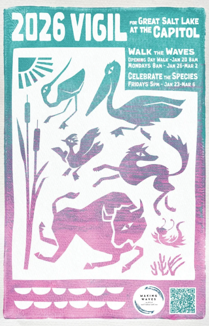2026 Great Salt Lake Vigil @ Utah State Capitol, 350 N State St, SLC. "Join the Making Waves Artist Collaborative for the 5th annual Vigil for Great Salt Lake! Celebrate the Species with us every Friday at 5 pm from January 23 to March 6 at the Capitol Building. Walk the Waves with us on Tuesday, January 20, at 8 am (opening day) and every subsequent Monday at 8 am from January 26 to March 2 at the Capitol Building. We can't wait for you to meet our new baby bison, kestrel, and coyote puppets."
