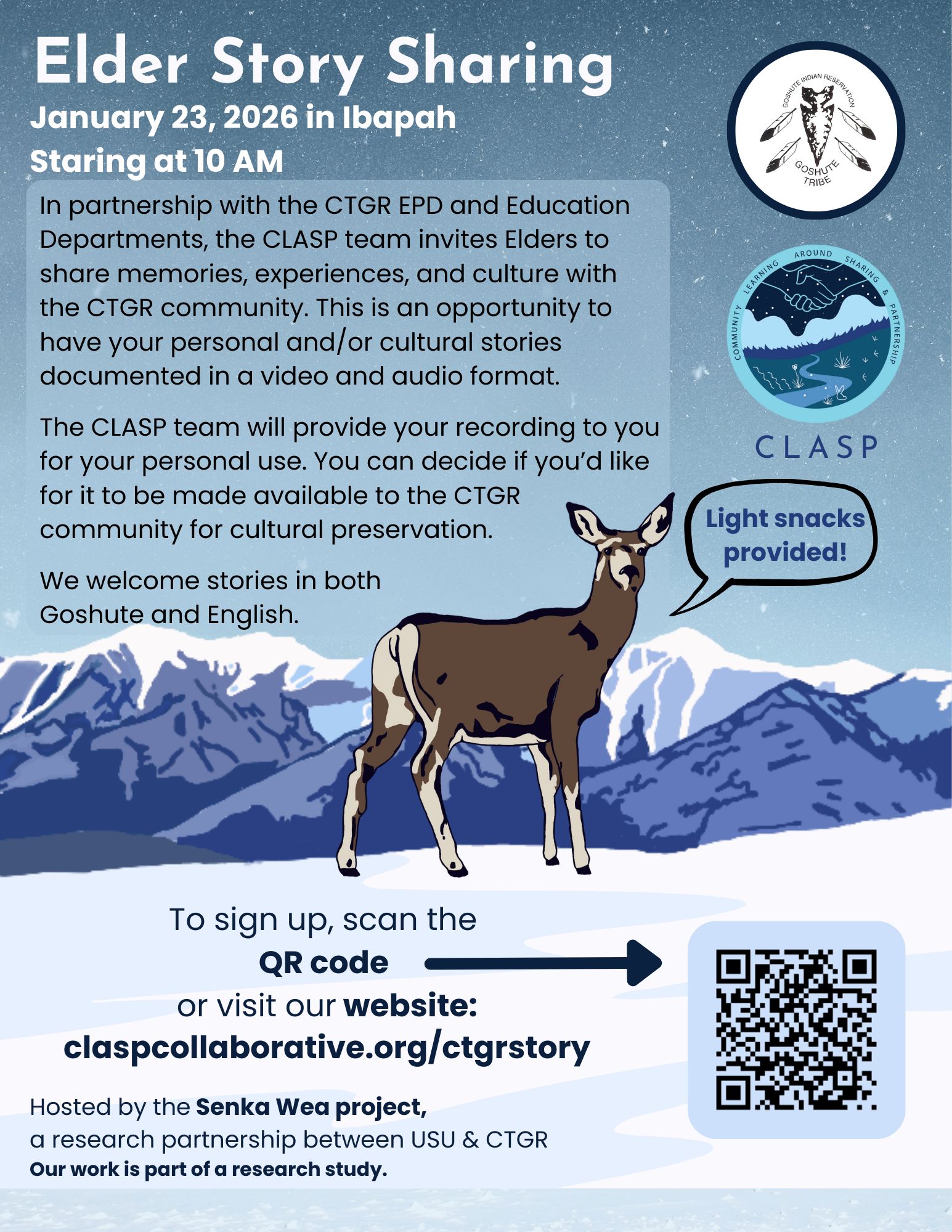 Senka Wea Elder Story Sharing | 10 AM in Ibapah, UT. Hosted by the Senka Wea Project, a research partnership between USU & the Confederated Tribes of the Goshute Reservation (CTGR): "The CLASP team invites Elders to share memories, experiences, and culture with the CTGR community. This is an opportunity to have your personal and/or cultural stories documented in a video and audio format. The CLASP Team will provide your recording to you for your personal use. You can decide if you'd like for it to be made available to the CTGR community for cultural preservation. We welcome stories in both Goshute and English." To sign up, click here.