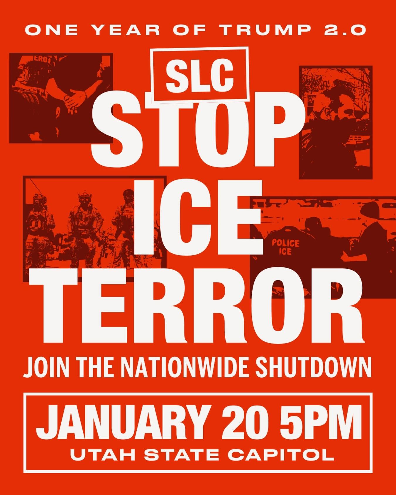Stop the Ice Terror Rally | 5 PM @ Utah State Capitol, 350 N State St, SLC. Event organizers include PSL Salt Lake, The Black Menaces, Utah Progressive Caucus and Utah March: "On the one-year anniversary of Trump taking office for the second time, millions of people across the country will walk out of work and school in opposition to the Trump administration’s racist, billionaire program. Trump has employed ICE and the military as his personal army against the working class at home and abroad in places like Venezuela. We refuse to allow Trump, ICE and the racist deportation machine to operate with impunity! Answer the call and join us in the streets on January 20 to say: STOP ICE TERROR! Justice for Renee Nicole Good! Only the people can defeat the Trump agenda!"