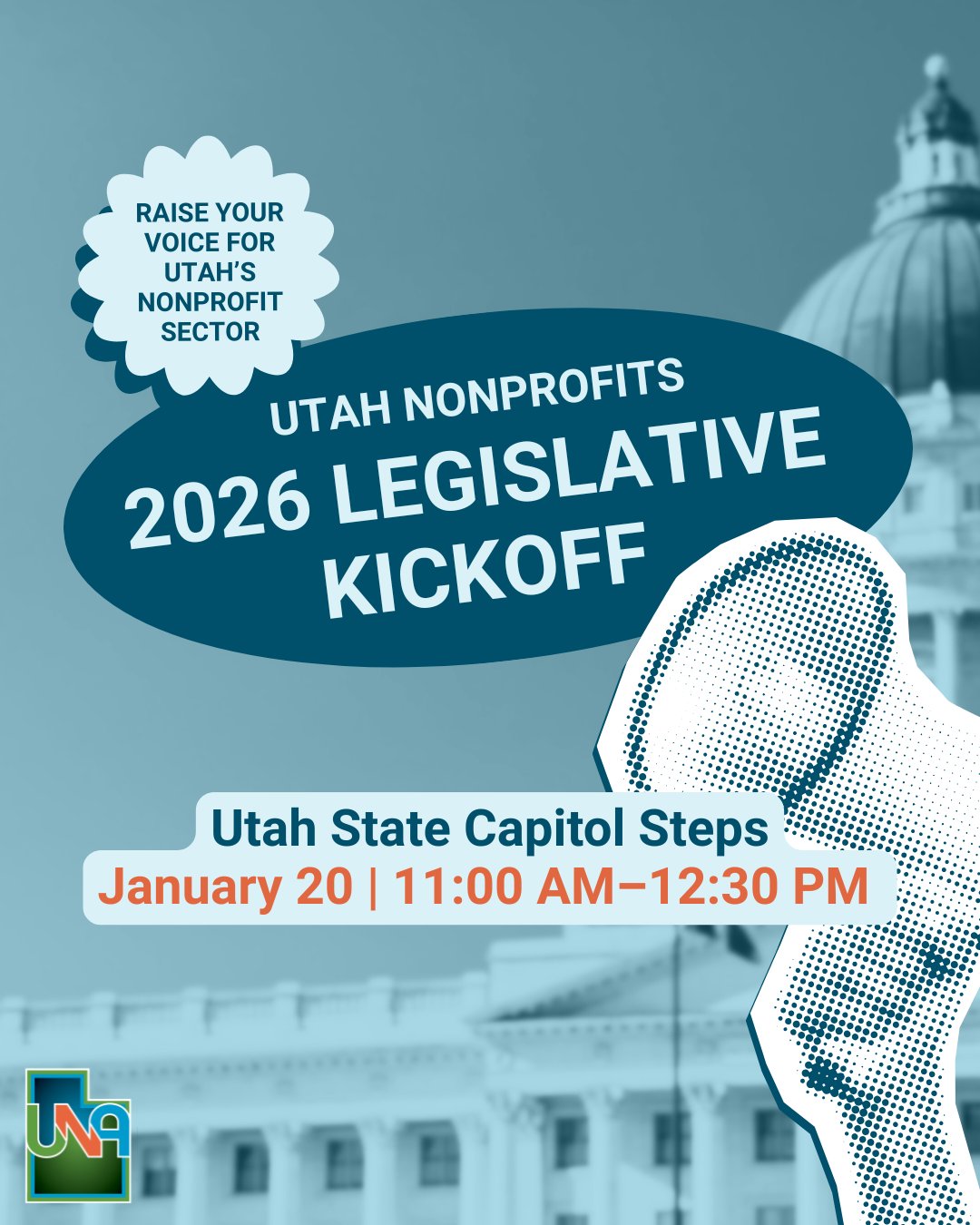 Utah Nonprofits 2026 Legislative Kickoff | 11a-12:30p on the south steps of the Utah State Capitol, 350 N. State St., SLC. Event by Utah Nonprofits Association: "Join us on the steps of democracy for a day that’s all about purpose, passion, and people-powered change. This is your moment to show up, speak out, and stand strong for the future of the nonprofit sector. Bring your banners, your passion, and your voice, and we’ll bring the energy! Let’s make some noise for the people who power purpose. See you on the Hill."