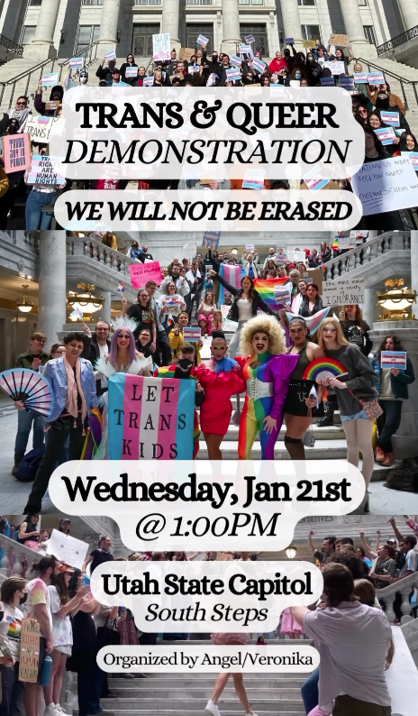 Trans & Queer Demonstration | 1:00 PM @ Utah State Capitol, 350 N State St, SLC. Organized by @VeronikaDaVil: "We will not be erased. Come in drag if you can!"