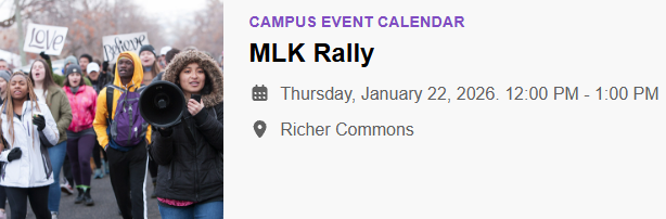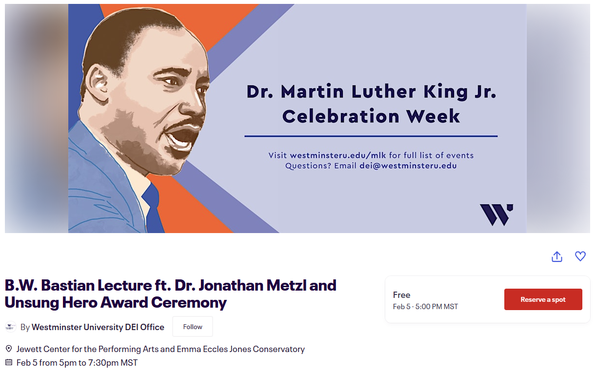 Westminster University MLK Rally | 12-1 PM @ Richer Commons, Westminster University, SLC. "This on-campus rally is part of Westminster University's annual Dr. Martin Luther King Jr. Celebration Week."