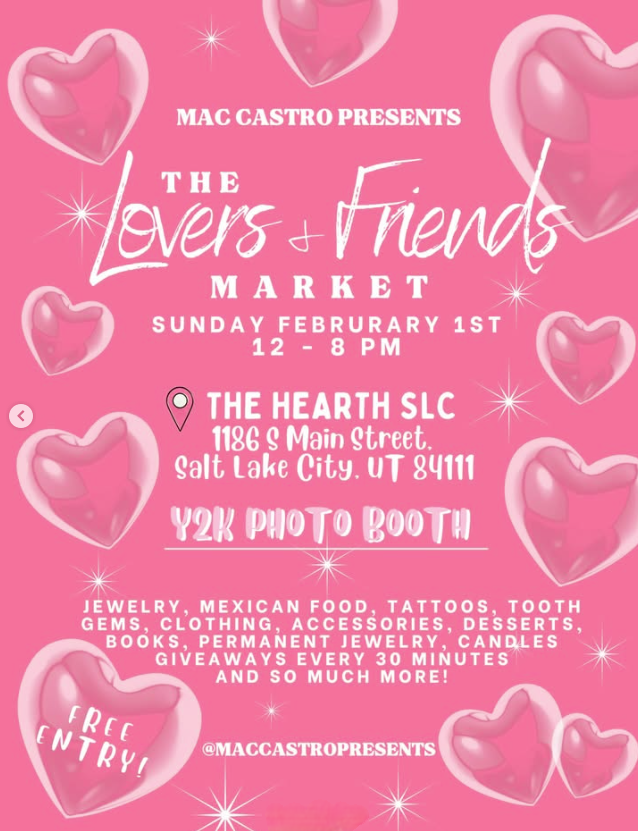 The Lovers and Friends Market from 12-8 PM at The Hearth, 1186 S Main Street, Salt Lake City. Hosted by Mac Castro and featuring a Y2K Photo Booth, Jewelry, Mexican Food, Tattoos, Tooth Gems, Clothing Accessories, Desserts, Books, Permanent Jewelry, Candles, Giveaways every 30 minutes, and so much more!
