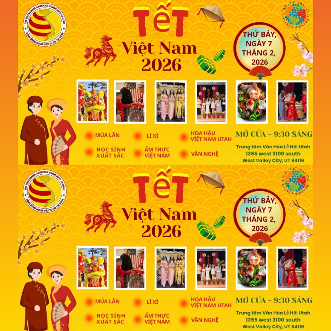 Join us for a day filled with traditional Vietnamese food, cultural performances, lion dances, Miss Vietnam Utah, Outstanding Student Awards, lucky money and fun activities for all ages. Come together to celebrate our heritage and bring in the Year of Horse! Chúc Mừng Năm Mới! Happy New Year!" FREE admission. Firecrackers/Lion Dance @ 10 AM.