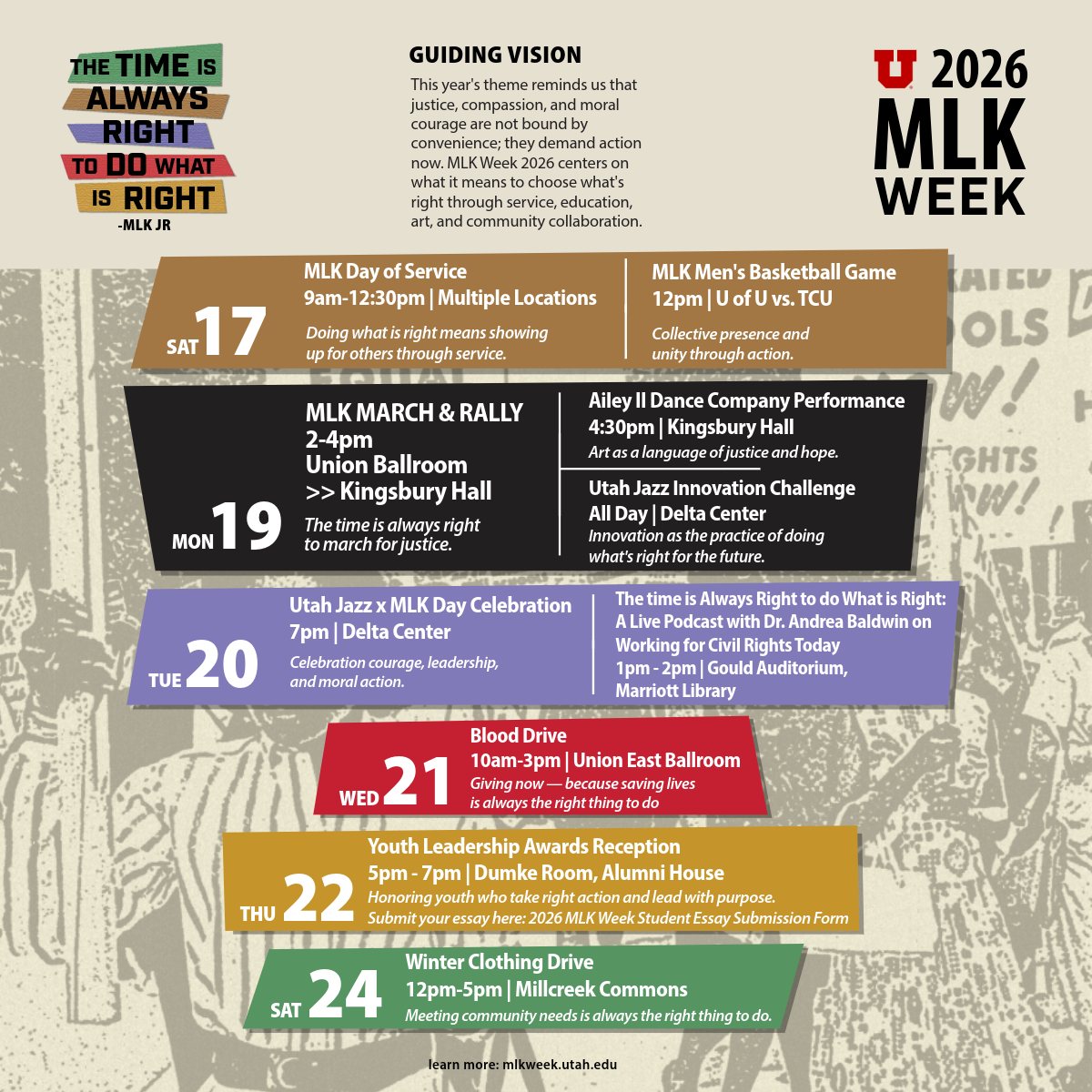 MLK Week at the UoU | various locations and events. "This year's theme — The Time is ALWAYS Right to do What is Right — reminds us that justice, compassion, and moral courage are not bound by convenience; they demand action now. MLK Week 2026 centers on what it means to 'choose what's right' through service, education, art, and community collaboration." For the full schedule, click here. #MLKWeek2026 #DoWhatIsRight #UofU