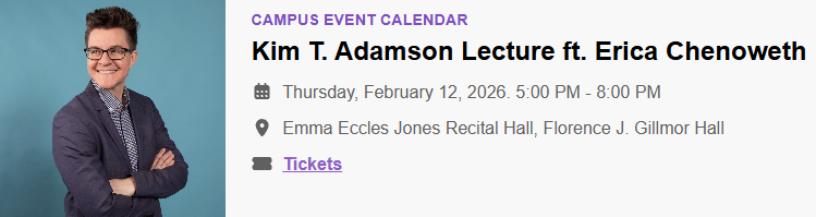 Kim T. Adamson Lecture ft. Erica Chenoweth| 5-8 PM @ Gore Concert Hall in the Jewett Center for the Performing Arts, Westminster University, SLC. "Researcher, author, and professor Erica Chenoweth studies political violence and its alternatives. At Harvard University, Dr. Chenoweth directs the Nonviolent Action Lab, an innovation hub that provides empirical evidence in support of movement-led political transformation. Dr. Chenoweth also maintains the NAVCO Data Project, one of the world’s leading datasets on historical and contemporary mass mobilizations around the globe. This lecture, part of the Kim T. Adamson Lecture in International Studies series, will focus on the topic of civil resistance, which is the subject of Dr. Chenoweth’s recent book Civil Resistance: What Everyone Needs to Know. There will be a pre-speaker reception at 5 PM, and the program will begin at 6 PM." The event is in-person, free, and open to the public. Registration is required. To reserve your spot, click here.
