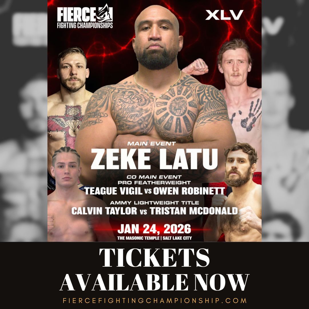 Fierce Fighting Championships | 4-11 PM @ Salt Lake Masonic Temple, 650 E South Temple, SLC. "Main Event with Zeke Latu. Co-Main Event, Pro Featherweight with Teague Vigil vs Tristan McDonald. AMMY Lightweight Title with Calvin Taylor vs Tristan McDonald. All ages - R&R BBQ - Alcohol (21+ with ID) - BadBev Drinks - and many more vendors! Doors Open @ 4 PM - Fights Start @ 5 PM. Get your tickets before we sell out... Again! MAKE SOME NOISE, UTAH!""