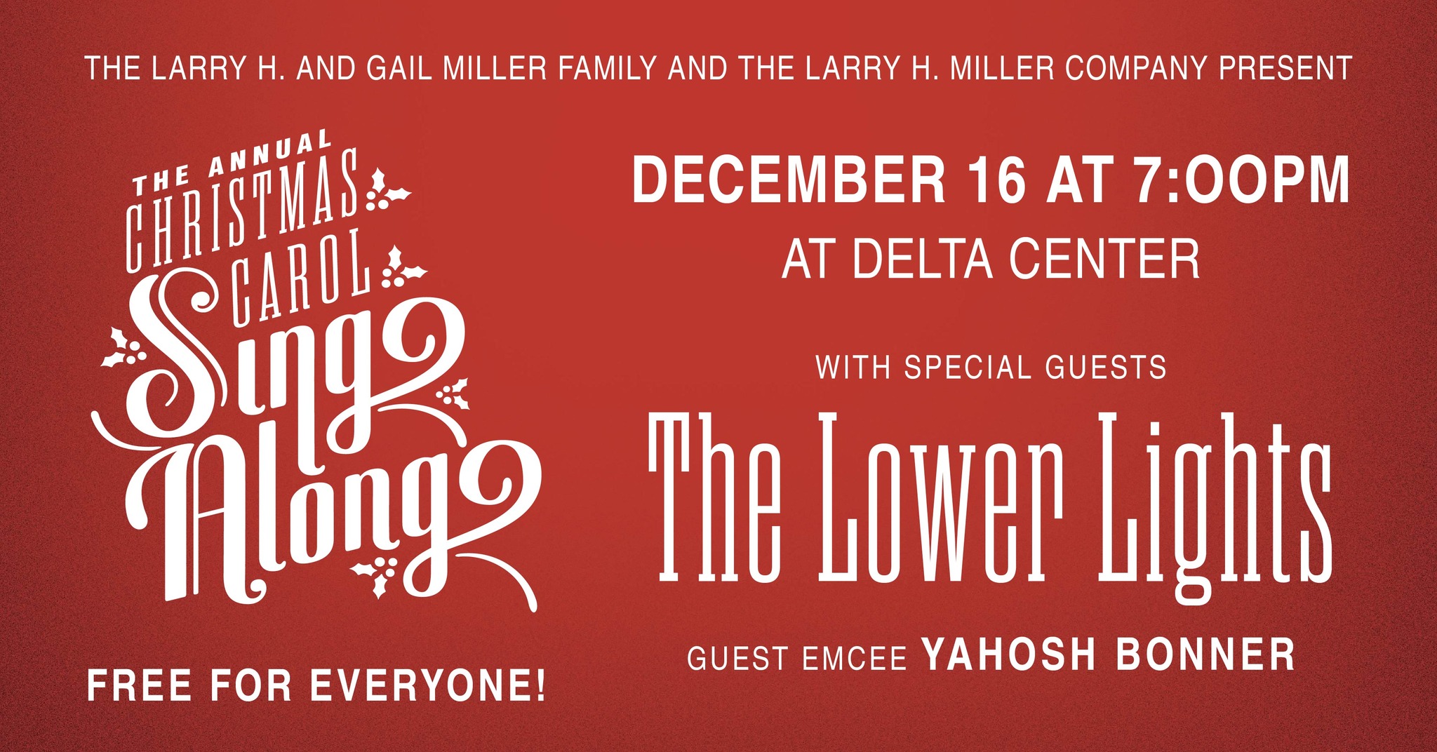 The Annual Christmas Carol Sing Along | Doors @ 6 PM, Music @ 7 PM @ Delta Center, 310 W South Temple St, SLC. Event by Larry H. & Gail Miller Family Foundation and The Larry H. Miller Company: "The Christmas Carol Sing-Along is back! Mark your calendars and join us at the Delta Center on Dec. 16 at 7:00 p.m. with the Lower Lights and Yahosh Bonner for an evening filled with music and holiday cheer. Admission is FREE for everyone."