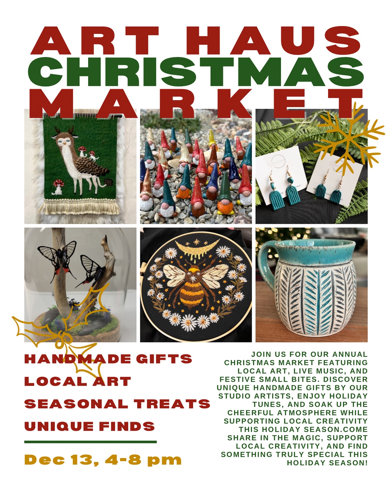 Art Haus Christmas Market | 4-8 PM @ Art Haus, 177 E 900 S Suite C, SLC. "An evening full of holiday cheer. We’ll be showcasing artists from our studio, all offering beautiful, handmade artwork—perfect for gifting (or keeping!). Enjoy live music, festive vibes, and plenty of seasonal treats while you shop local and support our creative community. Mark your calendars — we can’t wait to celebrate with you!"