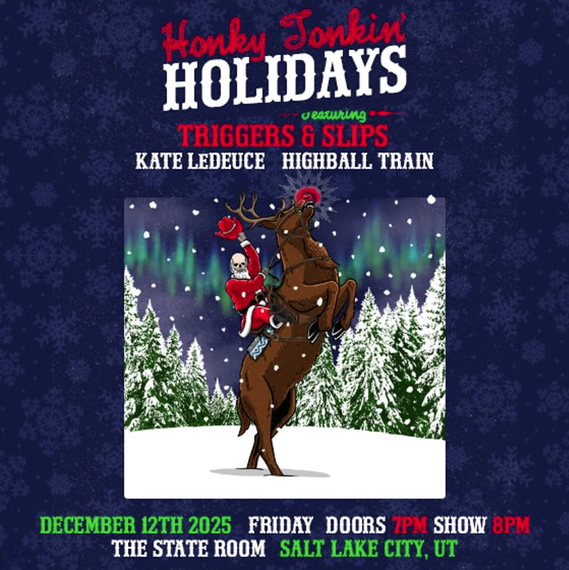 Honky Tonkin’ Holidays | Doors @ 7, Show @ 8 at The State Room, 638 S State St, SLC. "Salt Lake City’s Honky Tonk Heroes Triggers & Slips return to The State Room to bring you a special Honky Tonkin’ Holidays, joined by Kate LeDeuce and Highball Train. Dress in your favorite cowboy hats, pearl snaps, and two-steppin’ boots for a night of some of the best locally grown country music Utah has to offer." For tickets, click here.