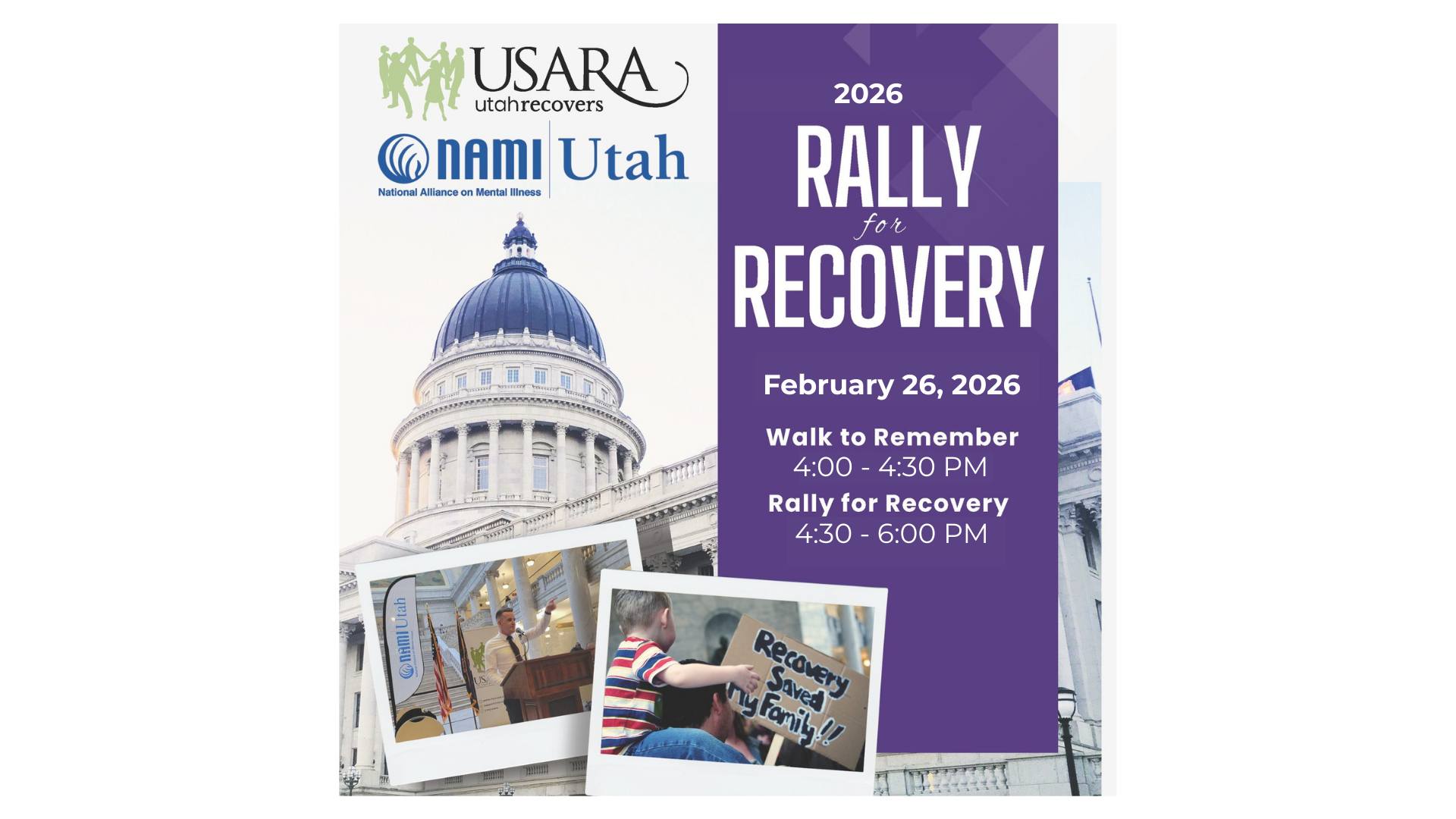 Rally for Recovery | 4:00-6:00 PM @ Utah State Capitol, 350 N State St, SLC. "Please join USARA, NAMI Utah, and Utah's recovery community for our 2026 Rally for Recovery at the Utah State Capitol on Thursday, February 26! The event begins at 4:00 PM with the Walk to Remember around the building to honor lives lost to substance use. The Rally for Recovery will begin at 4:30 PM in the rotunda. Speakers include people in recovery, allies, leaders, and legislators."