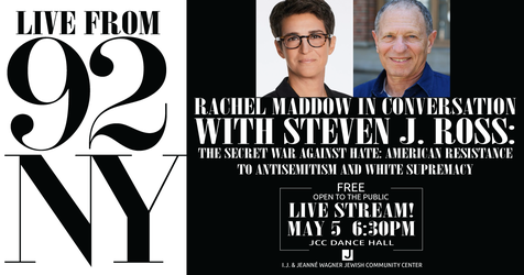 Live From 92NY Rachel Maddow in Conversation With Steven J. Ross: The Secret War Against Hate: American Resistance to Antisemitism and White Supremacy Tuesday, May 5 | 6:30 PM | JCC Dance Hall Free and Open to the Public | Bring ID. MS NOW host Rachel Maddow and Pulitzer Prize finalist Steven J. Ross have an urgent conversation about the new threat of white supremacy and antisemitism in the US, and what the rise and fall of hate groups in the wake of WWII can teach us about fighting it — and Ross’ new book, The Secret War Against Hate: American Resistance to Antisemitism and White Supremacy. https://www.slcjcc.org/pages/live-from-92ny/