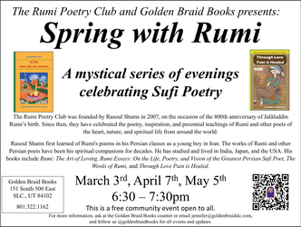 Join us the first Tuesday of every month this fall for a mystical series of evenings celebrating Sufi Poetry. The Rumi Poetry Club was founded by Rasoul Shams in 2007, on the occasion of the 800th anniversary of Jalâluddin Rumi’s birth. Since then, they have celebrated the poetry, inspiration, and perennial teachings of Rumi and other poets of the heart, nature, and spiritual life from around the world. Rasoul Shams first learned of Rumi's poems in his Persian classes as a young boy in Iran. The works of Rumi and other Persian poets have been his spiritual companions for decades. He has studied and lived in India, Japan, and the USA. His books include Rumi: The Art of Loving, Rumi Essays: On the Life, Poetry, and Vision of the Greatest Persian Sufi Poet, The Words of Rumi, and Through Love Pain is Healed. https://www.goldenbraidslc.com/events/spring-with-rumi-2026