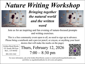 Bringing together the natural world and the written word. Join us for an inspiring and fun evening of nature-focused prompts and writing exercises. This is a free community event open to all, no need to sign up in advance. Please bring a notebook and a pen (or pencil, or crayon, or anything your heart desires that will make the marks on the page). https://www.goldenbraidslc.com/events/writing-workshop-series-nature-writing-february-2026