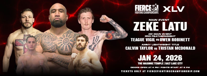 Jan. 24: Fierce Fighting Championships | 4-11 PM @ Salt Lake Masonic Temple, 650 E South Temple, SLC. Main Event with Zeke Latu. Co-Main Event, Pro Featherweight with Teague Vigil vs Tristan McDonald. AMMY Lightweight Title with Calvin Taylor vs Tristan McDonald. All ages - R&R BBQ - Alcohol (21+ with ID) - BadBev Drinks - and many more vendors! Doors Open @ 4 PM - Fights Start @ 5 PM.