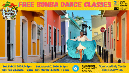 Bomba Marilé invites you to join us for a month of free weekly Bomba dance class at the: Sorenson Unity Center 1383 S 900 W SLC Saturday Feb 21, 2026 1-3pm Saturday Feb 28, 2026 1-3pm Saturday March 7, 2026 1-3pm Saturday March 14, 2026 1-3pm Classes will be taught by Liliana Rodriguez Muriel and Omar Gonzalez. You do not need to register for the classes. You are welcome to come to one or all of the classes and drop ins are welcome. Bring a bottle of water and comfortable shoes. Bring a long circular skirt if you would like to dance with one, we will also provide skirts for those who want to borrow one during class. Class is free thanks to the financial support of Salt Lake County Zoo arts and Parks and the Sorenson Unity Center. _________________________ Bomba Marilé te invita a participar en un mes de clases de baile de Bomba cada semana que serán gratuitas en el: Sorenson Unity Center 1383 S 900 W SLC Sábado 21 de febrero de 2026, de 13:00 a 15:00 Sábado 28 de febrero de 2026, de 13:00 a 15:00 Sábado 7 de marzo de 2026, de 13:00 a 15:00 Sábado 14 de marzo de 2026, de 13:00 a 15:00 Las clases serán enseñadas por Liliana Rodriguez Muriel y Omar Gonzalez. No es necesario registrarse. Puedes asistir a una o a todas las clases. Trae una botella de agua y zapatos cómodo. Si lo deseas, puedes traer una falda larga y circular para bailar; también tendremos faldas para quienes deseen usar una durante la clase. Las clases son gratuitas gracias al apoyo financiero del Departamento de Parques, Artes y Zoológicos del Condado de Salt Lake y del Sorenson Unity Center.